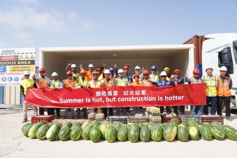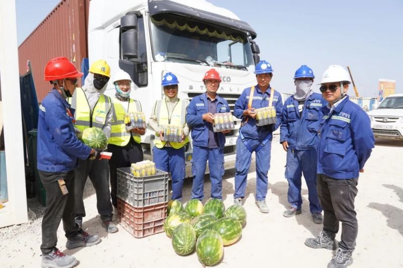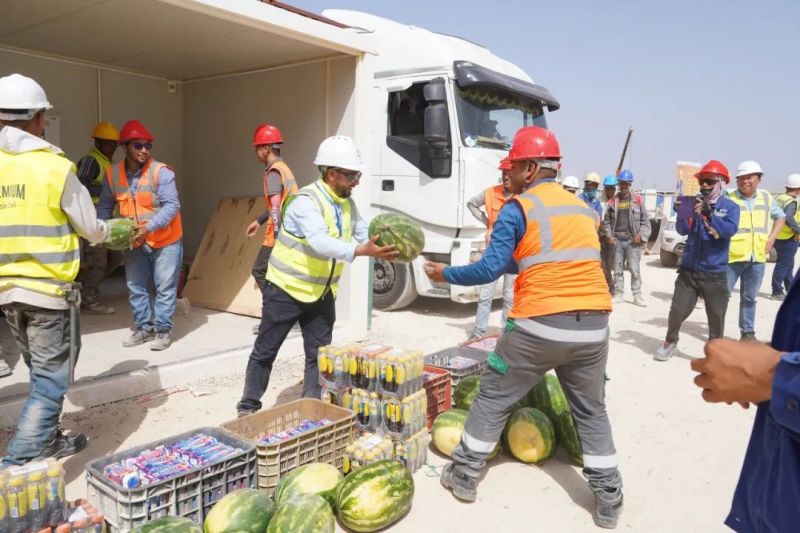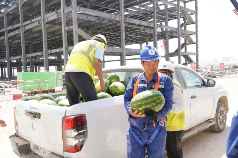 盡管高溫炙烤,項目現(xiàn)場的工人們?nèi)詧允匾痪€、不畏酷暑、辛勤工作,確保工程建設的順利進行。此次,摩洛哥項目組為施工人員準備了500瓶酸奶、500瓶涼茶、2000斤西瓜等防暑降溫物品,按各單位人數(shù)送至施工現(xiàn)場分配發(fā)放。
