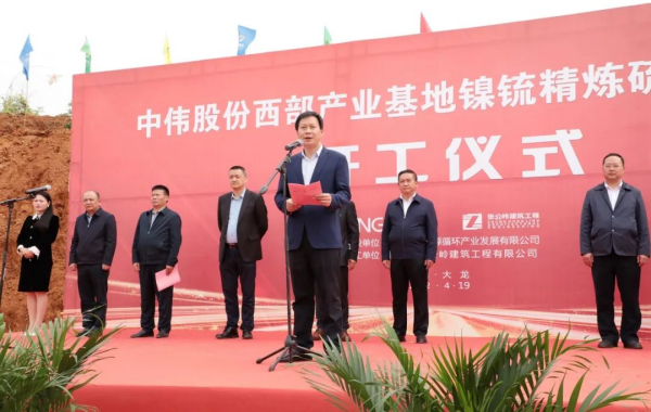 4月19日上午,中偉股份西部產(chǎn)業(yè)基地舉行鎳锍精煉硫酸鎳項目開工儀式。貴州省銅仁市政府副市長黃進出席儀式并為項目宣布開工,大龍開發(fā)區(qū)黨工委書記陳代才出席活動并講話,市政府副秘書長楊淵,市工信局局長肖寧,市促進局局長肖南,開發(fā)區(qū)黨工委委員、黔開公司黨委書記、董事長、總經(jīng)理游先勝,開發(fā)區(qū)黨工委委員、管委會常務副主任宋雨,中偉股份西部產(chǎn)業(yè)基地總經(jīng)理張朝華,中偉新材料黨委副書記、總經(jīng)辦主任羅丹丹等領導出席活動。儀式由開發(fā)區(qū)黨工委副書記、管委會主任姚元貴主持。市、區(qū)相關部門負責人,基地各部門、車間代表參加此次開工儀式。